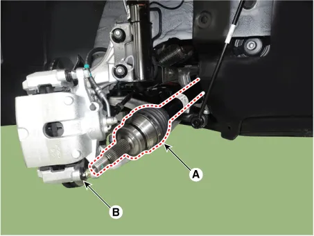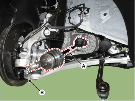 Separate the front driveshaft (A) from the knuckle assembly (B). [LH]