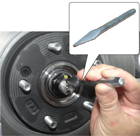 By hammering on a chisel, unlock the driveshaft lock hub nut caulking.
