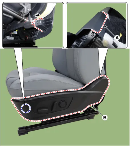 Remove the protector (A) and remove the front seat outlet shield cover (B) in the direction of the arrow by pressing the locking pin.