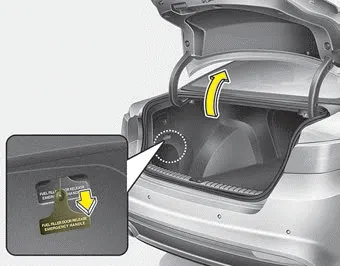 If the fuel filler lid does not open using the fuel filler lid opener button, you can open it manually. Open the trunk and slightly pull the emergency release handle on the left side.