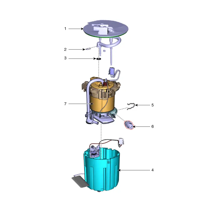 Components and components location Component 1. Fuel Sender Assembly 2. Fuel Pump Module Repair procedures Removal 1.
