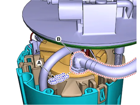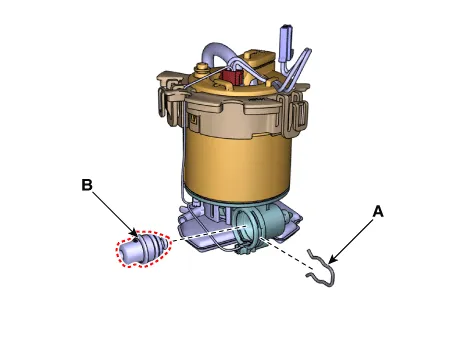 Remove the fuel feed tube quick-connector (B) after remove the clip (A).