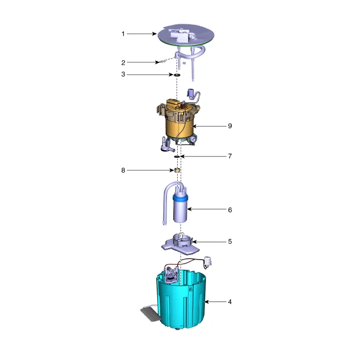 | 1. Plate Assembly 2. Clip 3. O-ring 4. Fuel Reservoir Cup 5. Fuel Pump Filter |