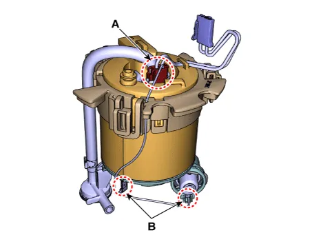 Remove the wiring from the fuel filter after disconnecting the fuel pump connector (A) and ground (B).