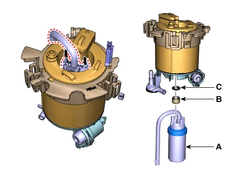 Remove the spacer (B) and O-ring (C) after removing the fuel pump & tube (A).