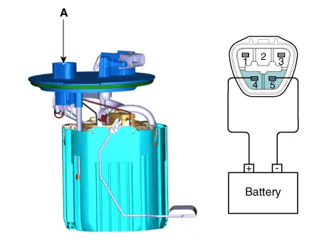 Check motor operation by fuel pump connector (A) connecting power (4) and ground (5).