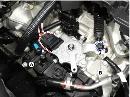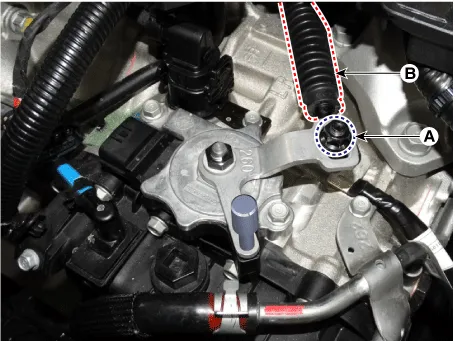Disconnect the inhibitor switch connector (A) and loosen the shift cable mounting nut (B).