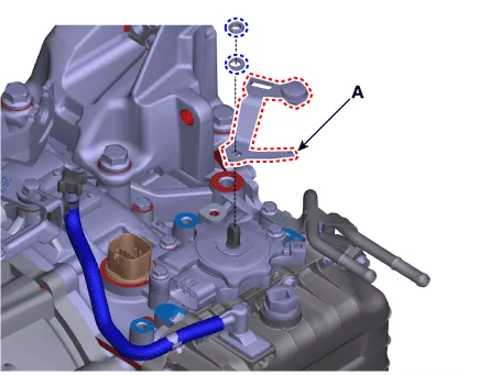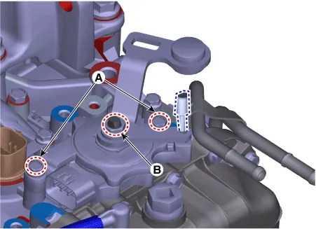 Tighten the inhibitor switch mounting bolts (A) and manual control lever mounting nut (B) with specified torque.
