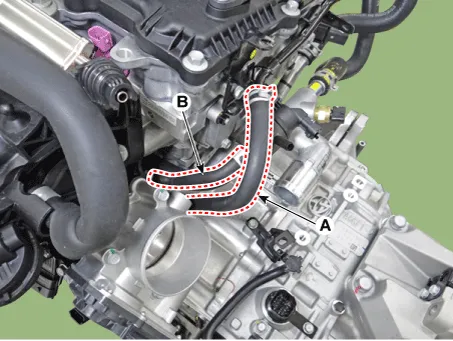 Disconnect the vacuum hose (A) and purge control solenoid valve (PCSV) hose (B).