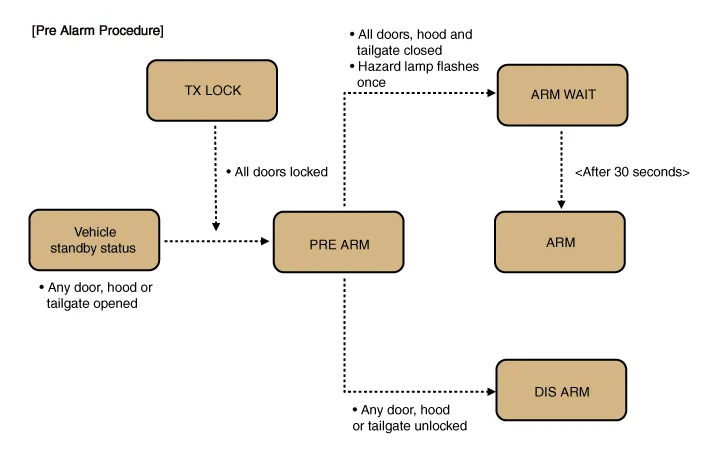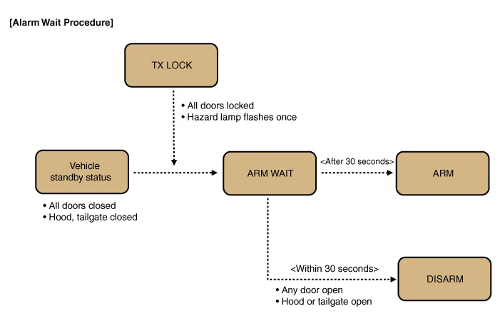 1-2. If the driver closes hood or tailgate, hazard lamp blinks one time and then the vehicle automatically enters "ARM" mode via "ARM WAIT" mode.