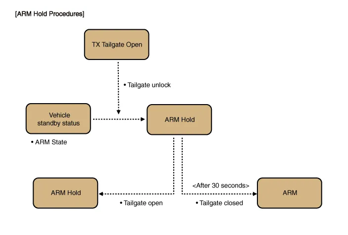 If tailgate is opened by a remote control (including smart key) in ARM mode, the vehicle enters ARM HOLD mode which holds off the burglar alarm only for the open tailgate.