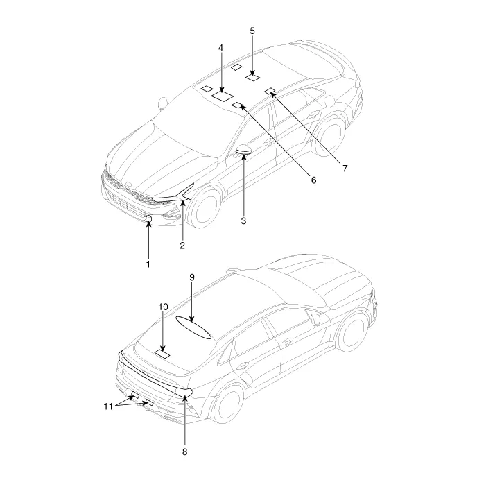 type) 8. Rear combination lamp 9. High mounted stop lamp 10. Trunk room lamp 11. License plate lamp |