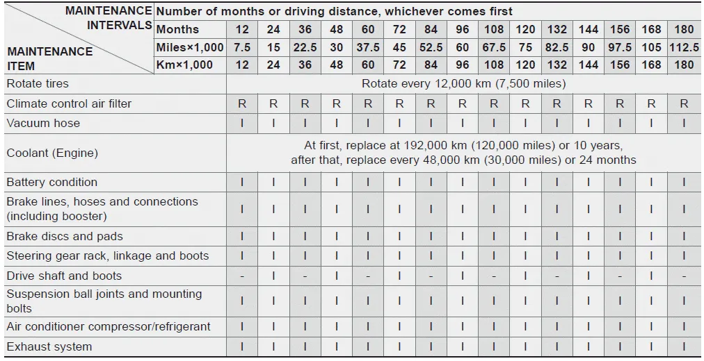 The following items must be serviced more frequently on cars normally used under severe driving conditions. Refer to the chart below for the appropriate maintenance intervals.