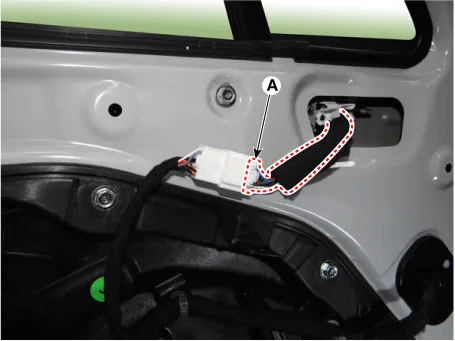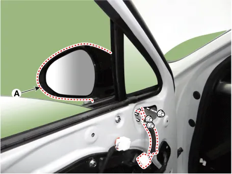 Disconnect the outside rear view mirror connector (A).
