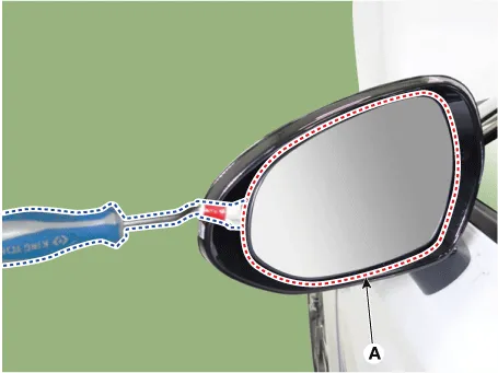 Using a screwdriver or remover, remove the outside rear view mirror cover (A).