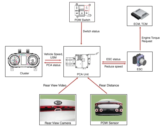 | 1. Cluster (USM) 2. Parking collision-avoidance assist (PCA) Unit |