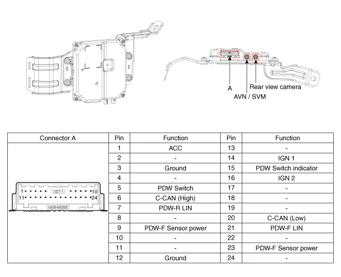 Schematic diagrams Connector and Terminal Function Pin Function Pin Function 1 PAS mode switch 13 SVM mode indicator 2 PAS mode indicator 14 SVM mode switch 3 - 15 - 4 Detent 16 Ground 5 EPB switch1 17 EPB switch2 6 EPB switch3 18 EPB switch4 7 - 19 - 8 - 20 IGN1 9 Battery (+) 21 illumination (+) 10 - 22 - 11 ISG mode indicator 23 illumination (-) 12 ISG mode switch 24 Auto hold mode Repair procedures Inspection 1.