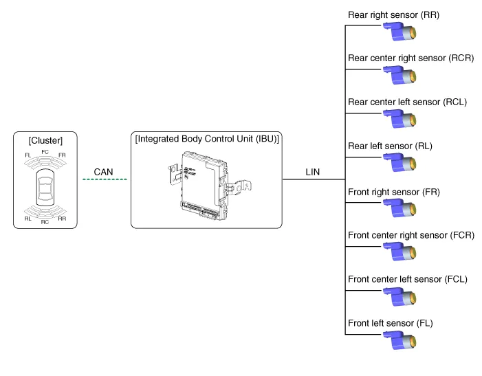 PDW consists of 8 sensors (front : 4 units, rear : 4 units) that are used to detect obstacles and transmit the result in three separate warning levels, the first, second and third to IBU via LIN communication. |