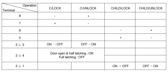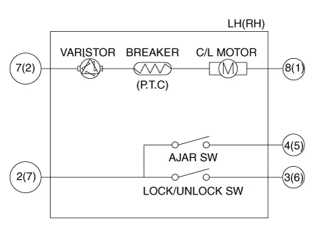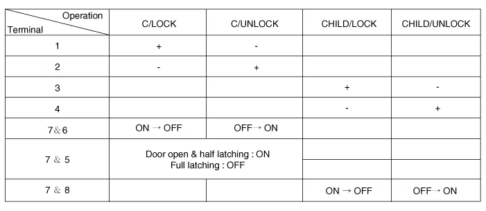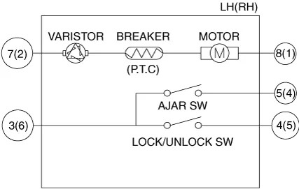 Check actuator operation by connecting power and ground as shown below. To prevent damage to the actuator, apply battery voltage only momentarily. [Central Lock]