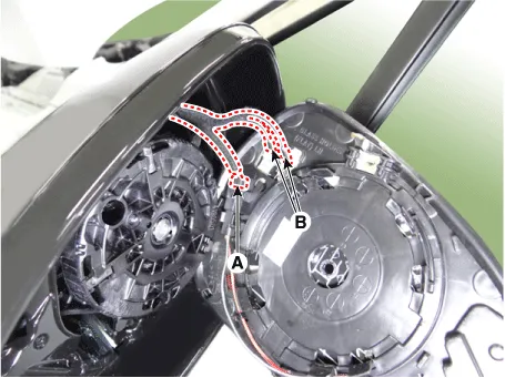 Disconnect the mirror heater connectors (A) and rear corner radar indicator connector (B).