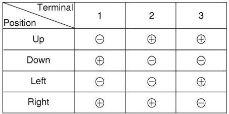 Apply battery voltage to each terminal as shown in the table and verify that the mirror operates properly. [Mirror Control]