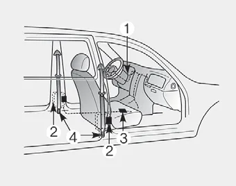The seat belt pre-tensioner system consists mainly of the following components. Their locations are shown in the illustration: