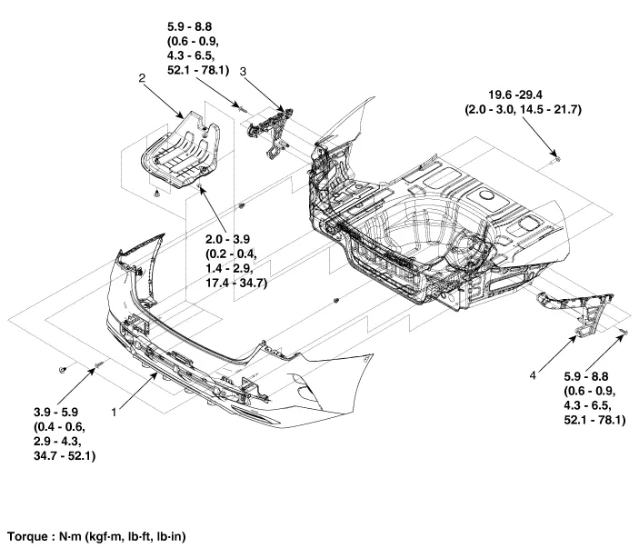 | 1. Rear bumper assembly 2. Rear bumper side under cover |