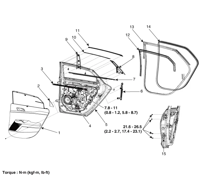 10. Rear door weatherstrip molding 11. Rear door frame molding 12. Rear door window glass run 13. Rear door side weatherstrip 14. Rear door body side weatherstrip 15. Rear door hinge |