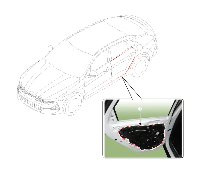 Components and components location Component Location 1. Rear door window glass Repair procedures Replacement • When removing with a flat-tip screwdriver or remover, wrap protective tape around the tools to prevent damage to components.