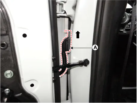 Release the locking pin in the direction of the arrow and remove the rear door main wiring connector (A).