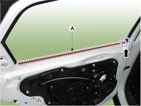 Carefully adjust the rear door window glass (A) until the bolt are visible, then loosen them. separate the glass from the glass run and carefully pull the glass out through the window slot.