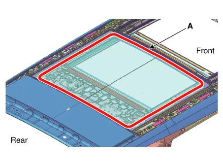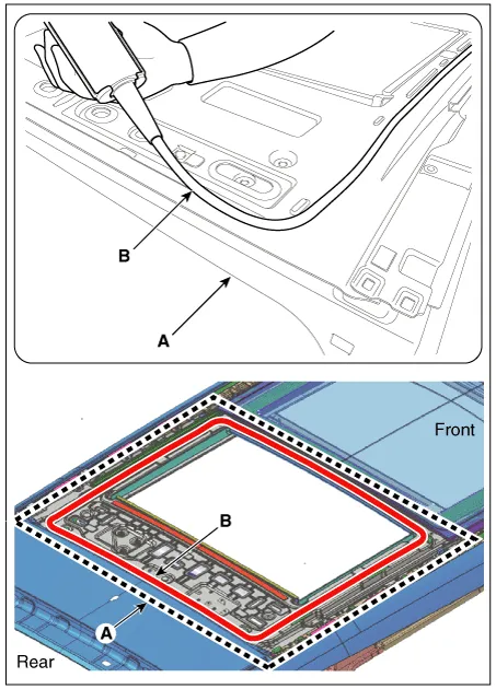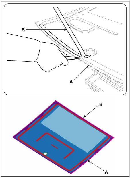 If rear glass (A) is reused, use a blade to remove residual sealant (B) around the body panel.
