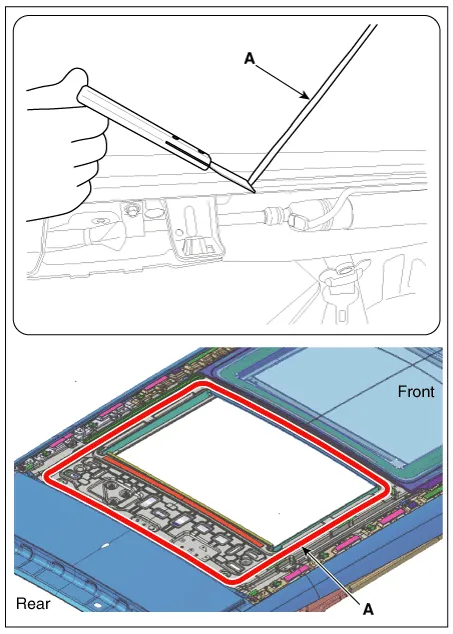 Pull the square wire (A) to the left and right, then apply a force in the direction of the arrow to cut off the residual sealant.