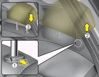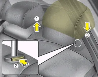 To raise the headrest, pull it up to the desired position (1). To lower the headrest, push and hold the release button (2) on the headrest support and lower the headrest to the desired position (3).
