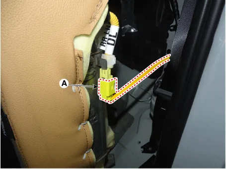 Press the lock pin and separate the rear seat airbag connectors (A).