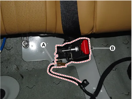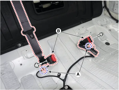 Loosen the mounting bolts and remove the rear seat belt buckle (B).