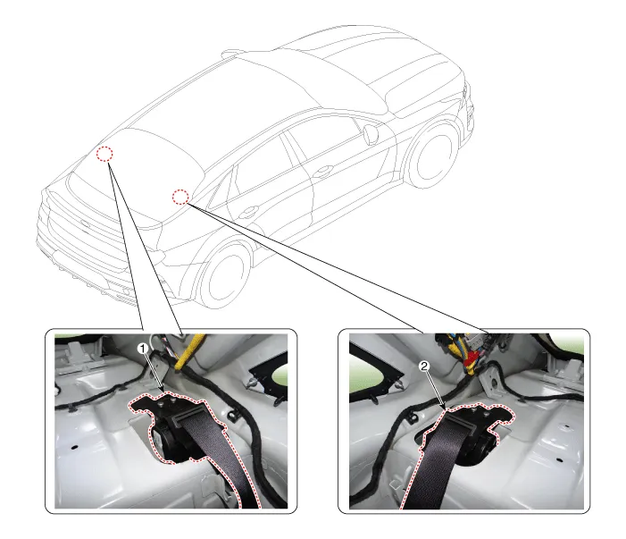 Components and components location Component Location 1. Rear center seat belt retractor Repair procedures Replacement • When installing the belt, make sure not to damage the retractor.