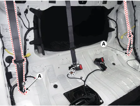 Loosen the mounting bolts and remove the rear seat belt lower anchor (A).