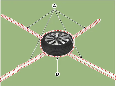 Lay the rope (A) on the floor to form a cross and place the wheeled tire (B) over it.