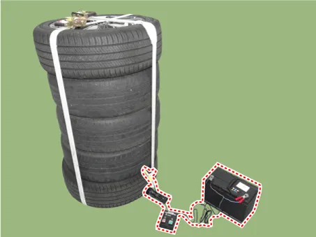 Place three waste tires (A) first, then place wheeled tire (B) on top of the pile. |