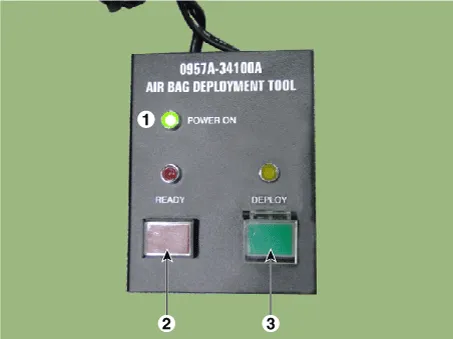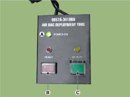 When the POWER ON (A) is illuminated on the airbag deployment tool, press READY (B), and then DEPLOY (C) to deploy the airbag.