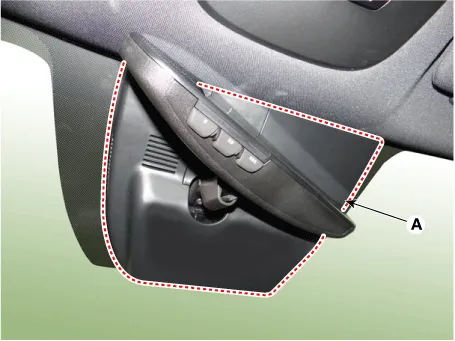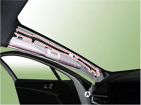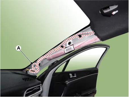 Disconnect the roof trim main connector (A) and the mounting clips in the front pillar. [LH]