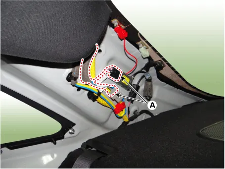 Disconnect the connectors (A) and the mounting clips in the rear pillar.