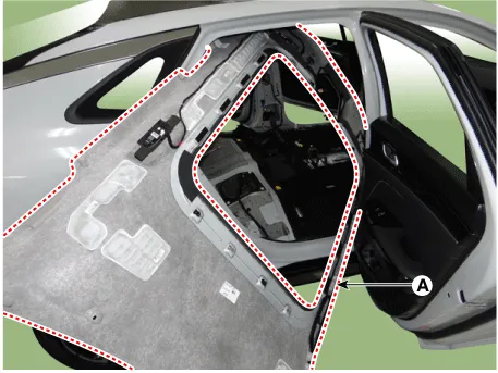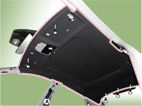 Remove the roof trim assembly (A) from the body panel and then carry it out of the vehicle through the rear door.