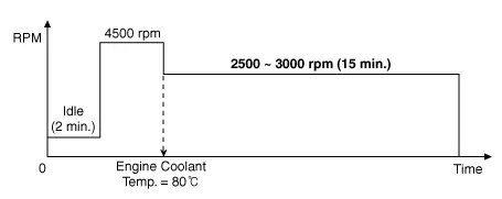 Step on the accelerator pedal and hold it steady at 4500 rpm with the shift lever in N position to warm up the engine until the temperature of the engine coolant reaches 80°C. |