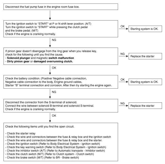 The starting system includes the battery, starter, solenoid switch, ignition switch, inhibitor switch (A/T), clutch pedal switch (M/T), ignition lock switch, connection wires and the battery cable.