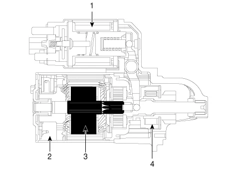 | 1. Solenoid 2. Brush 3. Armature 4. Over runing clutch |