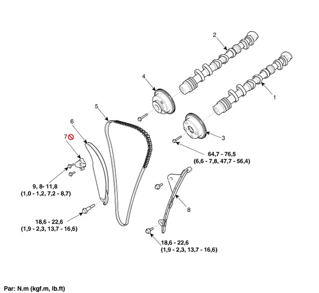 chain 6. Timing chain tensioner arm 7. Timing chain tensioner 8. Timing chain guide |