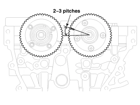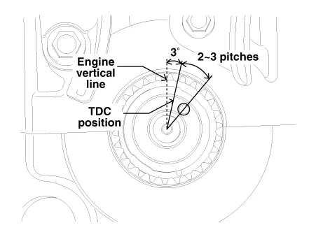 Turn the crankshaft clockwise (about 2-3 pitches) from the TDC position (the dowel pin (A) of crankshaft is about 3° with the engine vertical line) as rotation of the intake CVVT sprocket from the TDC position.