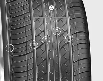 If the tire is worn evenly, a tread wear Indicator (A) will appear as a solid band across the tread. This shows there is less than 1.6 mm (1/16 inch) of tread left on the tire. Replace the tire when this happens.